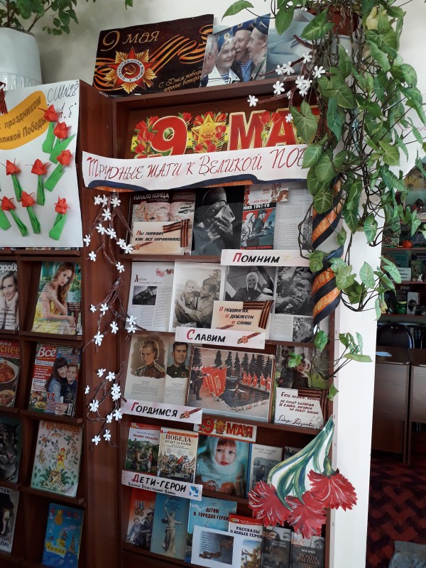 Далее мероприятие проходило в библиотеке №9. На абонементе библиотеки встречала гостей развёрнутая, красочная книжная выставка «Трудные шаги к Великой Победе». Мы вспомнили песни, военные песни современных и тех времён. До слёз трогательные, отважные, зовущие в бой, песни о любви, русские, широкие и певучие. Ведь годы войны - это годы целых жизней и судеб. Трогали сердце воспоминания каждого о своей семье, о военном детстве, послевоенном времени, голоде и холоде. И снова пели песни, плакали, душевно пили чай с пирогами, а со старых, пожелтевших от времени фотографий смотрели на нас наши герои. Наши родные и близкие. Сегодня мы учимся у них беззаветной преданности и любви к своей Родине, смелости, достоинству, мужеству стойкости. 9 мая коллектив библиотеки как и многие,чьи родные сложили головы за Великую Победу, участвовали во всемирной акции "Бессмертный полк". И наша акция "Подари гвоздику ветерану", которую провели сотрудники библиотеки №9 на площади в центре города в знак благодарности и великой памяти, нашла отклик в каждом сердце.