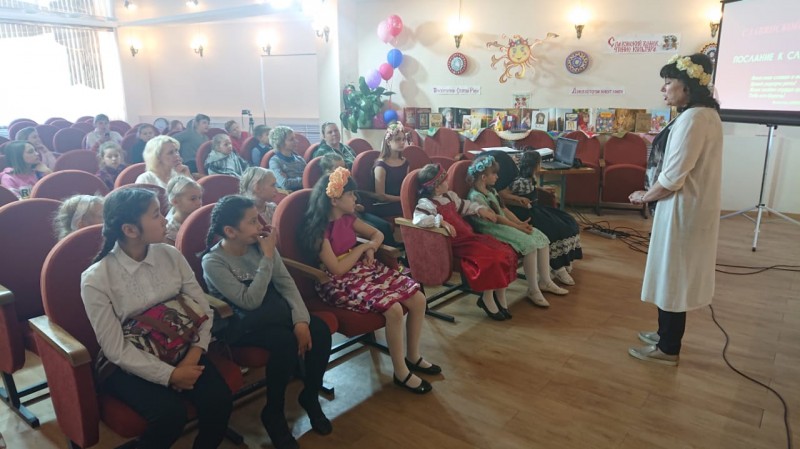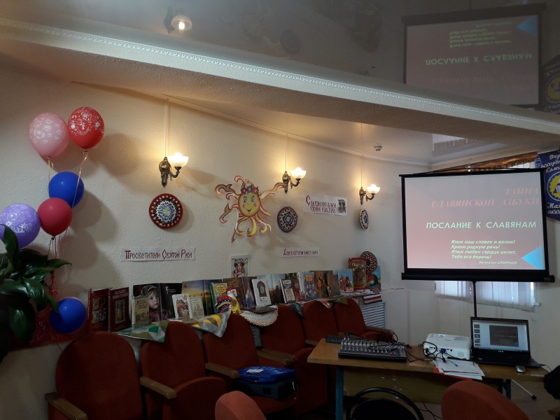 Во все времена деятельность библиотек была немыслима без тесной связи со школами, дошкольными образовательными учреждениями и учреждениями дополнительного образования. Библиотека №9 имеет свои традиции, опыт общения с читателями разных категорий: от малыша до его родителей, от ученика до его учителя. Совместные мероприятия получаются интересными, зрелищными и представляются совершенно в другом свете. Так 17 мая в зале детской музыкальной школы №5 прошло мероприятие под названием «Славянский венок», ко Дню славянской письменности и культуры. Вместе со славянкой, сказочными героями, музыкой и песнями наши гости путешествовали по удивительной Стране знаний. Узнали, откуда пошла славянская письменность, кто такие братья Кирилл и Мефодий, историю создания азбуки, письменности, первых книг и библиотек. Наш славянский венок играл яркими красками и благоухал свежим ароматом музыки и нежных цветов. Ребята, родители, преподаватели с удовольствием участвовали в занимательных играх и конкурсах. Оформление мероприятия - электронная презентация «Солунские братья» и развёрнутая книжная выставка «Славянский венок, чтение, культура». Но и выставка была не простая, украшали её предметы русского быта, изготовленные нашими мастерицами. Это и поделки из соломки, покрывала и накидки в лоскутной технике, вышитые подзоры и полотенца. Особый колорит нашему празднику придали русские наряды, в которых были все участники.