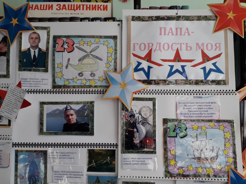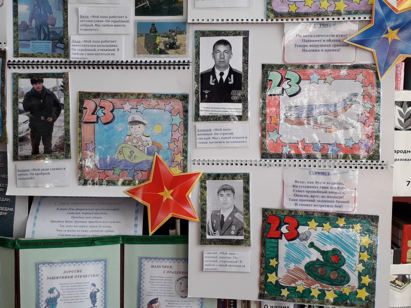 В читальном зале библиотеки совместно с Детским садом №50 оформлен необыкновенный, красочный коллаж « Папа гордость моя!». Фотографии пап, братьев, дедушек, оформленные стихотворениями, трогательными высказываниями, детскими рисунками. Рассказывая о своих работах, дети отмечали, что их папы самые замечательные, сильные, ловкие, как они гордятся и любят своих пап. Все читатели без исключения, с неподдельным восторгом глядя на эту выставку, испытывали глубокие чувства патриотизма за наших защитников.