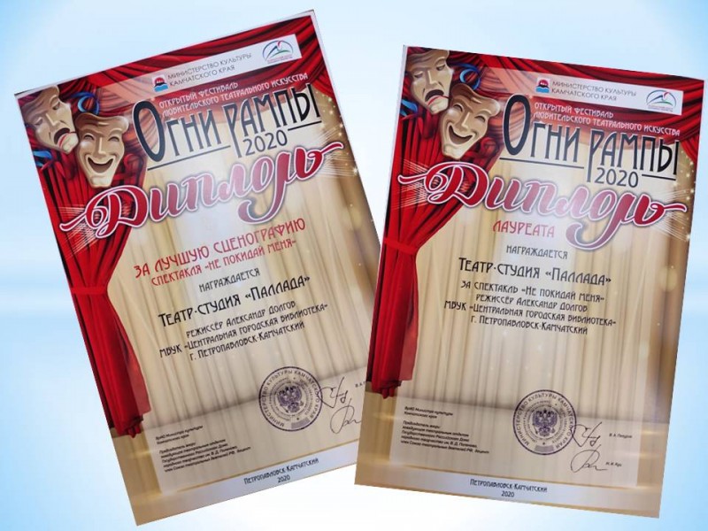 Театр-студия «Паллада» МБУК «Центральная городская библиотека» (г. Петропавловск-Камчатский) под руководством режиссера Александра Долгова стал лауреатом фестиваля «Огни рампы - 2020», а сам руководитель – обладателем диплома за лучшую мужскую роль!