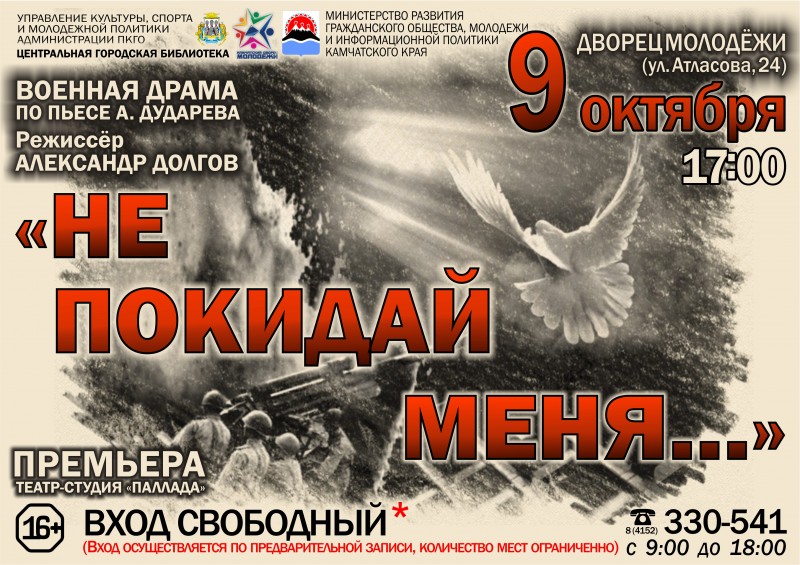 Приглашаем вас на премьеру спектакля "Не покидай меня" театр-студии "Паллада". Это военная драма о молодости и любви по одноименной повести Алексея Дударева. Действие происходит в 1944 году во время начала Белорусской наступательной операции.