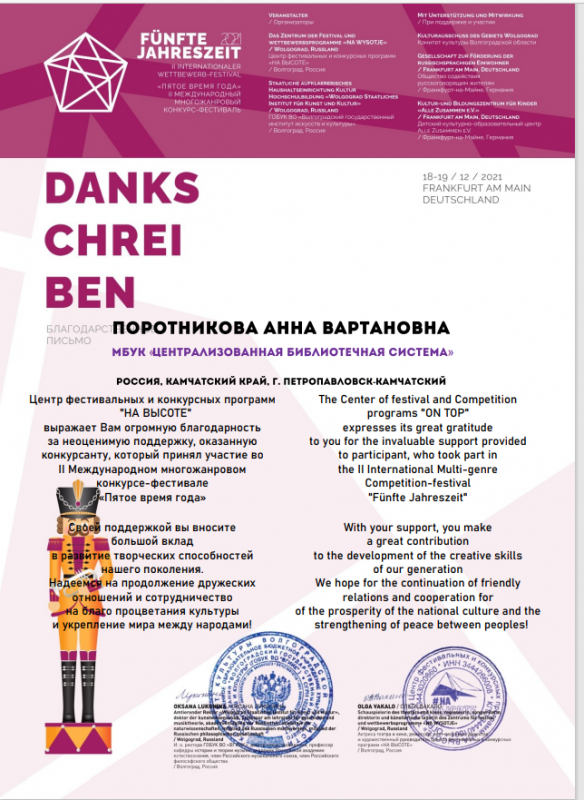 За неоценимую поддержку, оказанную творческому коллективу, благодарственным письмом организаторов "Пятого времени года" отмечена и директор Централизованной библиотечной системы г. Петропавловска-Камчатского Анна Вартановна Поротникова.