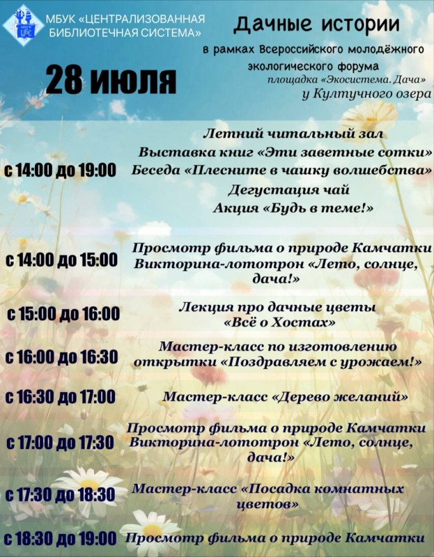 28 июля на протяжении всего мероприятия на площадке у Култучного озера будет работать летний читальный зал, где каждый желающий сможет взять журналы, посвящённые даче. Будет представлена выставка «Эти заветные сотки». Книги, представленные там, можно прочесть на месте, воспользовавшись читальным залом, или в последующем прийти в библиотеку и взять понравившийся экземпляр домой. Так же все желающие смогут узнать, как правильно заваривать иван-чай и продегустировать его.