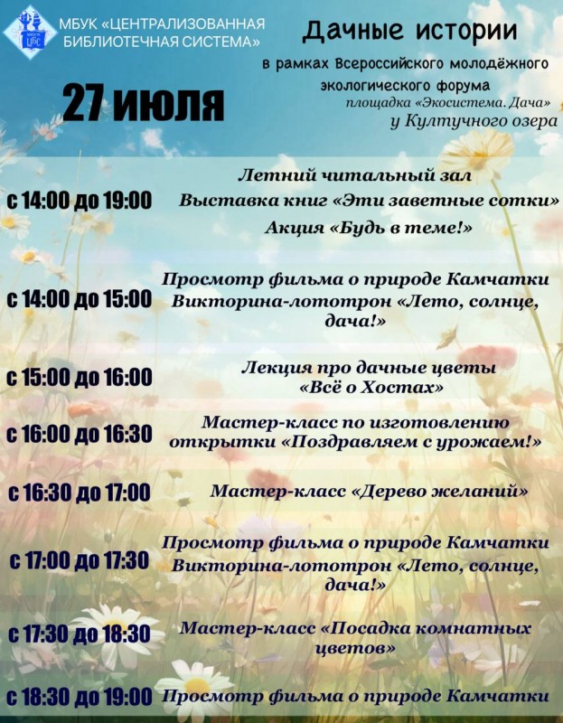 Мероприятие «Дачные истории» в рамках Всероссийского молодёжного экологического форума «Экосистема. Дача» ПЕРЕНОСИТСЯ на 27 июля. Время и место остаются неизменными. с 14:00 до 19:00 на площадке «Экосистема. Дача» на территории у Култучного озера.