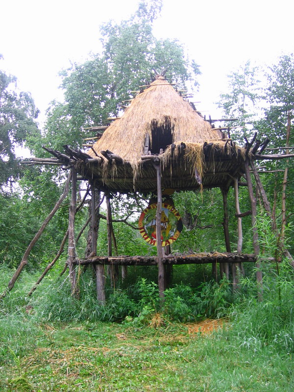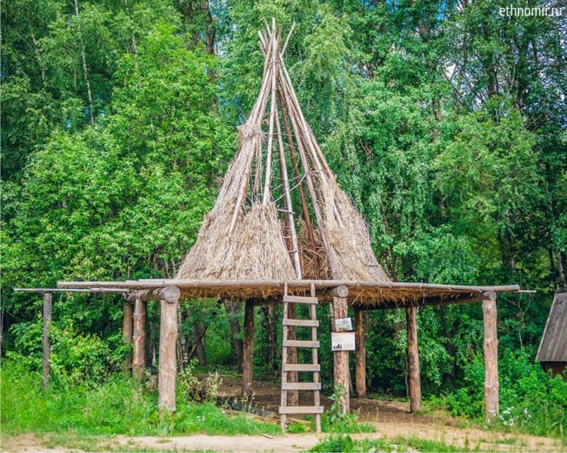Летние жилища. В конце XVII--начале XVIII в. каждая семья имела и летнее жилище, в котором жила с ранней весны до поздней осени. Устройство его описал С. П. Крашенинников: «Сперва ставят девять столбов вышиною сажени по две и больше, в три ряда в равном расстоянии. Столбы связывают перекладинами, на перекладинах мостят пол кольем и устилают травою: поверх полу делают из колья высокой востроверхой шатер, которой, обрешетят прутьями или тонкими кольями ж, покрывают травою. Траву прижимают кольем, а для крепости, чтоб не сносило ветром, концы верхнего колья с концами нижнего связывают ремнями и веревками. Двери у них делаются с двух сторон, одни против других прямо. Ходят на балаганы по таким же лестницам, как в зимние юрты». Конусообразная или четырехскатная крыша ставилась прямо на помост, который имел со всех сторон большую внешнюю площадку. В XX в. наиболее распространенной стала заимствованная двускатная форма крыш.