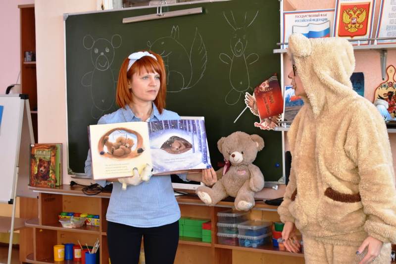 Мишутка вновь заглянул в детский сад "Ладушки". Он пришел не один, в этот раз с ним к ребятам пожаловала медвежонок Маша в исполнении сотрудника информационно-библиотечного центра. Маша тоже захотела подружиться с детьми. Друзья принесли с собой замечательные сказки о своих собратьях. Об одном из них - Медведике - Маша и рассказала с помощью красочно иллюстрированной книги американской писательницы Кармы Уилсон "Когда Медведик спит" с замечательным переводом Михаила Яснова . Всем очень понравился этот гостеприимный косолапый. Мы весело играли с мишками, знакомились с книгами.