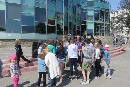 Далее ребята с удовольствием подпевали песне Игоря Демарина «Мой дом Петропавловск-Камчатский». Затем ребятам рассказали о празднике – Международном Дне коренных народов мира. Также мы выяснили, что на камчатке проживает 5 коренных малочисленных народов: алеуты, ительмены, коряки, эвены и чукчи. Библиотекарь загадала ребятам корякские и ительменские загадки, с которыми они легко справились. А вот над загадками современного камчатского писателя Виктора Евдокимова пришлось призадуматься. Затем библиотекари поиграли с участниками в игру «Море волнуется раз…». Продолжилось мероприятие подвижными играми и конкурсами на ловкость и сноровку. Далее с ребятами был проведён подвижный танец на ускорение ритма «Мы пойдём налево, мы пойдём направо».