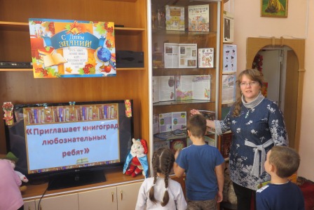 Экскурсия началась со знакомства с библиотекой и историей её основания. Заведующий информационно-библиотечного центра для детей и юношества провела беседу - экскурсию по чудесной стране Читалии! Ребята попали в удивительный город Книгоград страны Читалии, где вместо улиц - ряды книжных стеллажей, вместо этажей - книжные полки, дома - это тома книг. А у каждого дома своё название. Также дошкольники узнали о том, кто является жильцами этого удивительного города - литературные герои книг.