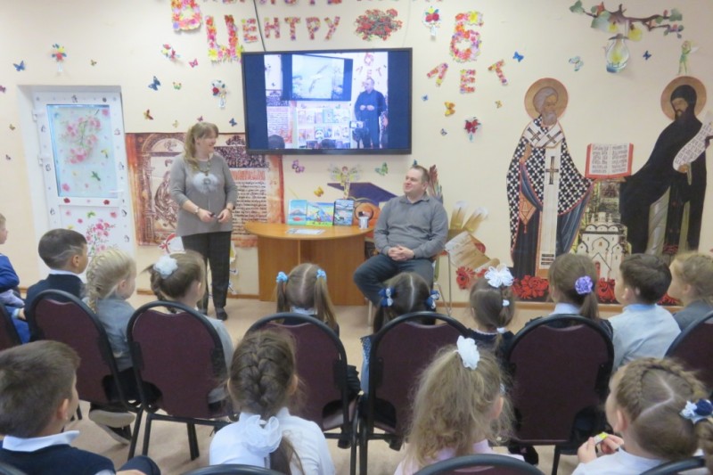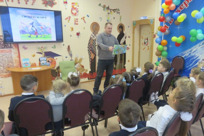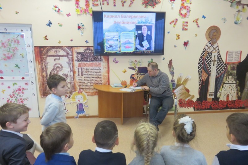 Далее писатель ответил на волнующие вопросы ребят. Ребятам было очень интересно узнать - во сколько лет К. Алейников начал писать книги. Школьников удивил тот факт, что Кирилл Алейников не стал писателем в детстве. А начал писать свои детские книги всего лишь 5 лет назад для своих сыновей Мирона и Платона.
