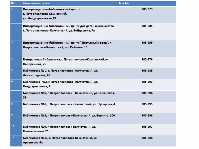 *Адреса библиотек Централизованной библиотечной системы Петропавловска-Камчатского: