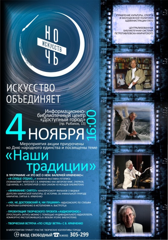 Программа «Ночи искусств» в информационно-библиотечном центре «Доступный город» соберет почитателей многогранного таланта мэтра камчатской культуры Валерия Трофимовича Кравченко.