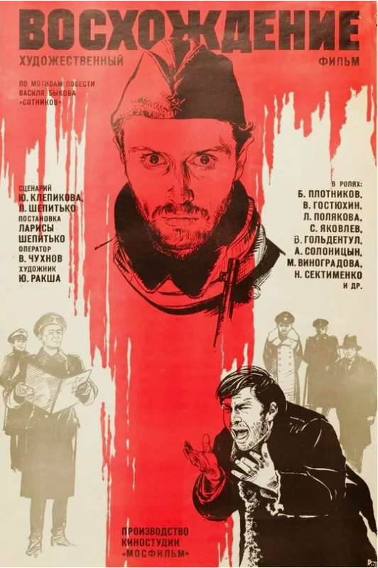 | Обложка одного из изданий | Афиша к художественному фильму Л. Шепитько "Восхождение" по мотивам повести "Сотников", 1976 |