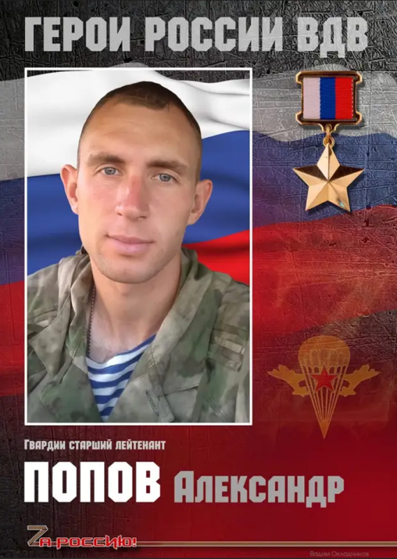 Александр Попов был заместителем командира роты десантно-штурмовой бригады. Его группа выполняла задачу по прикрытию позиций российских войск. Ценой жизни старший лейтенант защитил стратегически важный рубеж, в сражении был дважды тяжело ранен, но до последнего командовал взводом. Этот бой 23 июня 2022 стал для него последним.