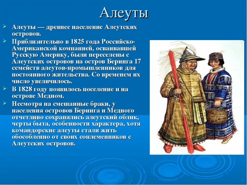 В книге показывается современное состояние изучения проблемы древнейшей истории населения Алеутских островов, рассматриваются этнокультурные изменения у алеутов во времена Русской Америки, затем в американский период их истории. Характеризуется этнокультурная ситуация у алеутов США в конце 19 – 20 вв. Рассказывается об особом этническом пути командорских алеутов.