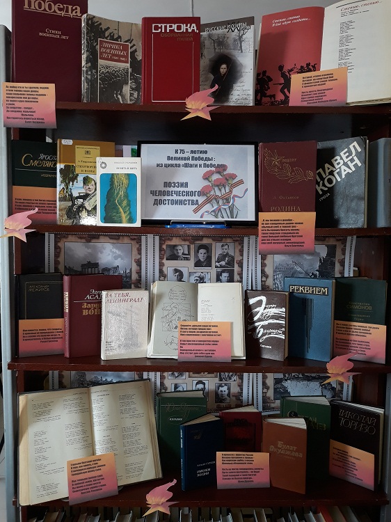 Поэты – фронтовики! Их искренняя и честная лирика протянулась сквозь годы светлой грустью воспоминаний о трепетном юношестве, о больших надеждах и оборвавшихся на полуслове мечтах… Их имена навсегда останутся на страницах книг, их подвиги будут вечно жить в сердцах многих поколений. В преддверии Дня Победы и Всемирного Дня поэзии в библиотеке №5 оформлена книжная выставка «Поэзия человеческого достоинства» из цикла «Шаги к Победе», обзор которой мы предлагаем нашим читателям.