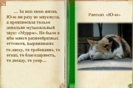 В произведении «Ю-ю», повествуется о кошке по кличке Ю-ю, которая жила в одной семье. Имя зверьку придумал четырёхлетний сын. Мальчик, увидев зверька, от удивления смог произнести только несколько звуков. После этого случая все и стали звать кошечку Ю-ю. Вначале котёнок был ничем не примечателен. Как все кошачьи детёныши много спал, лакал молочко, играл.