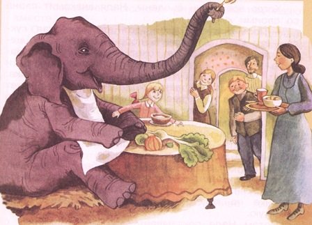 Книга «Слон» повествует о девочке Наде. Как то она заболела, и к ней вызвали доктора – Михаила Петровича. После осмотра девочки врач объявил, что у Нади встречается «равнодушие к жизни». Чтобы лечить ребенка, доктор посоветовал развеселить ее. За счёт этого, когда Надя попросила привезти слона, отец сделал все что можно, чтобы сделать ее просьба. После общего чаепития девочки со слоном она легла спать, а наутро встала совсем здоровой.