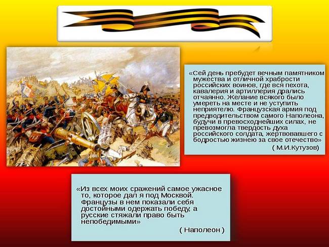 Бородино! 26 августа (7 сентября) 1812 года началась битва, которая стала решающей в войне, первой в нашей истории получившей официальное название Отечественной. И не случайно! Против Наполеона воевала вся страна. С захватчиками сражались не только военные, но и простые горожане, крестьяне создавали партизанские отряды и громили французов. Это был год необыкновенного подъёма патриотических чувств всех россиян. Стойкость русского войска, где каждый солдат, офицер, генерал был героем, опрокинула все расчеты французского полководца.