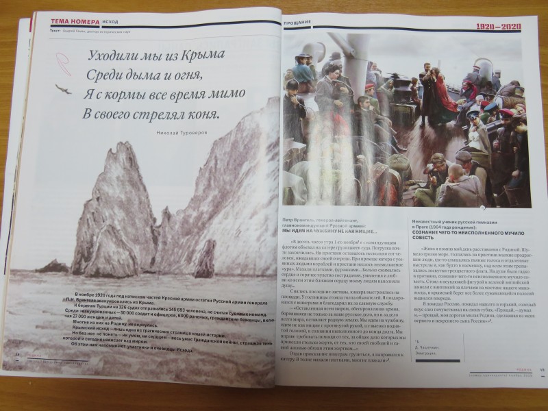 Главная тема номера – Исход, раскрывается в нескольких статьях, посвященных эмиграции из Советской России. Доктор исторических наук Андрей Ганин рассказывает об эвакуации остатков армии барона Врангеля из Крыма, приводит свидетельства очевидцев, а в статье «Лишние люди» он же кратко повествует о судьбе тех, кого потеряла Россия вместе с первой волной эмиграции. Это такие известные люди, как писатель Аркадий Аверченко, чемпион мира по шахматам Александр Алехин, поэт Константин Бальмонт, писатели Иван Бунин, Александр Куприн, Дмитрий Мережковский, Владимир Набоков, Алексей Толстой; балерина Матильда Кшесинская, композитор Сергей Рахманинов, авиаконструктор Игорь Сикорский, художники Илья Репин и Марк Шагал и многие другие.