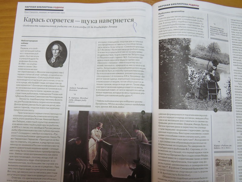 Завершается рубрика Научная библиотека Родины статьей кандидата исторических наук Ильи Сидорчука «Карась сорвется – щука навернется» об особенностях национальной рыбалки от Александра III до Владимира Ленина. Рыбалка во времена императора Александра считалась неблагородной забавой. Ею занимались женщины и дети, а для мужчин главной забавой считалась охота.