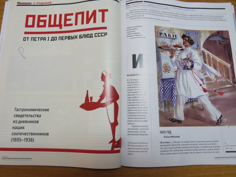 В статье «Общепит» кандидата исторических наук Миши Мельниченко из рубрики Прожито с Родиной показана история российского общепита от Петра Iдо первых блюд СССР и приведены гастрономические свидетельства из дневников наших соотечественников с 1805 по 1936 год.