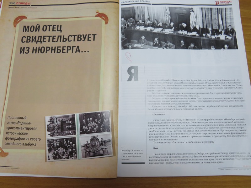 В год 75-летия Победы постоянный автор «Родины» Николай Долгополов прокомментировал фотографии своего отца, присутствовавшего на Нюрнбергском процессе в качестве корреспондента «Известий» и Совинформбюро. Он рассказывает о том, как держались обвиняемые и обвинители на этом процессе. 10 военных преступников по приговору Нюрнбергского трибунала были казнены, что вызвало удовлетворение автора, хотя он и не считает себя кровожадным человеком.