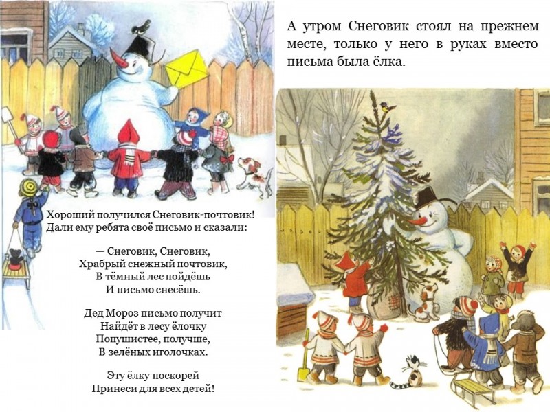 «Какой Новый год без ёлки?» - подумали дети и написали письмо Деду Морозу. Ведь только Дедушка Мороз может прислать из леса самую пушистую ёлочку. Так начинается сказка Владимира Григорьевича Сутеева «Ёлка». Успеет ли Снеговик привезти детворе лесную красавицу? Конечно, успеет, но сколько препятствий ему предстоит преодолеть! В 1955 году по сказке "Ёлка" был снят мультфильм «Снеговик-почтовик».