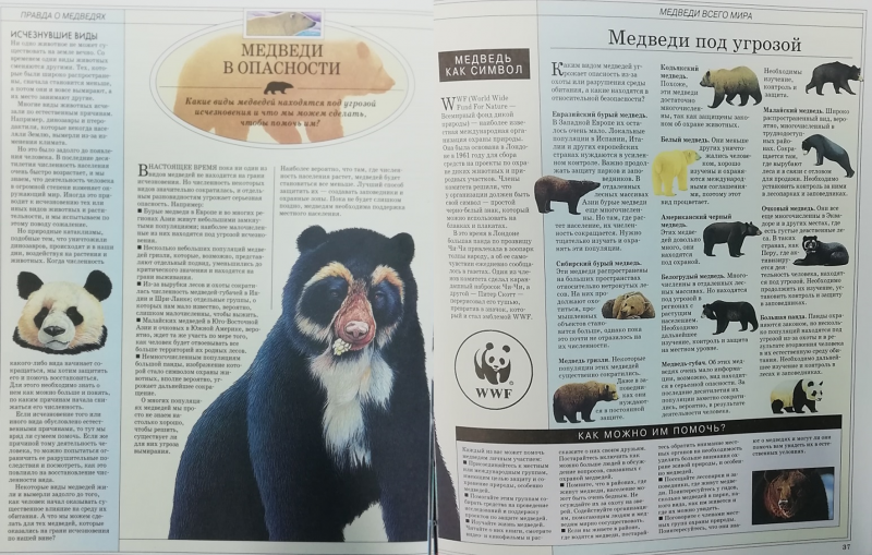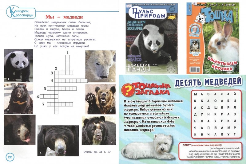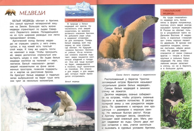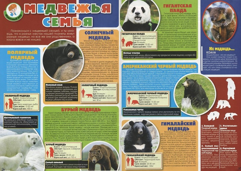 На страницах весёлого журнала о животных вы прочитаете удивительные истории о разных видах медведей обитающих на нашей планете Земля.