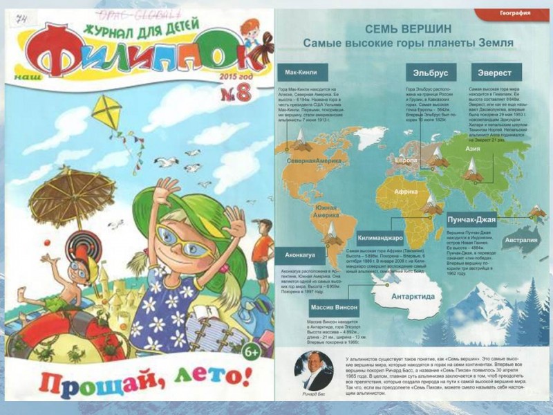 Семь вершин : самые высокие горы планеты Земля // Наш Филиппок : иллюстрированный журнал для детей от 6 до 12 лет. – 2015. - № 8. – С. 22. - (География).