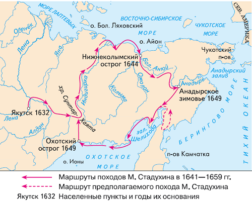 Ранней осенью Стадухин вернулся на Колыму и начал готовить новый поход на Анадырь. В начале марта 1650 г. небольшой отряд вышел на юго-восток и через семь недель достиг ясачного зимовья в среднем течении Анадыря, которое построил Дежнёв в 1649 г. Тот вместе с Семеном Моторой появился тут неделей раньше. К сожалению, между землепроходцами возникли разногласия, причины которых сейчас установить крайне затруднительно. В самом начале 1651 г. Стадухин со своим отрядом ушел из Анадырского зимовья на реку Пенжину. Спустившись по ней до Охотоморского побережья и построив кочи, осенью он перебрался на зимовку к устью Гижиги.