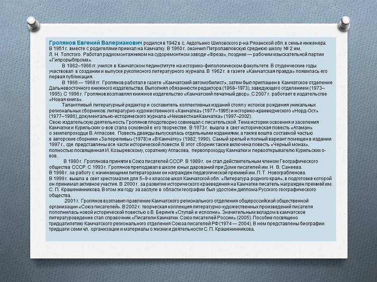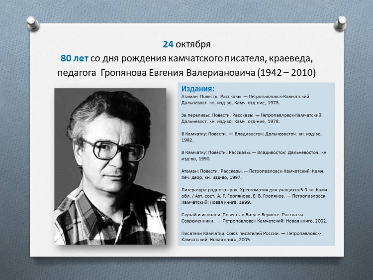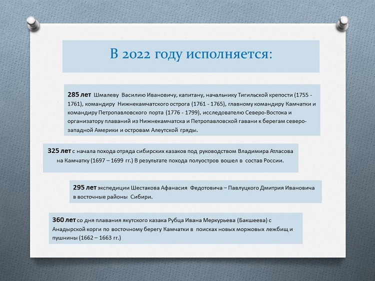 Продолжая знакомство с памятными датами 2022 года стоит отметить, что многие из них касаются людей, чьи биографии недостаточно широко отражены в книжных изданиях. Тем не менее, информация о них публиковалась в различных средствах массовой информации в течение прошлых десятилетий и зафиксирована в краеведческой систематической картотеке статей, которую библиотека №5 ведёт с 1980 года. Специалисты библиотеки советуют всем читателям, интересующимся историей Камчатки, не упускать этот способ нахождения необходимой информации.