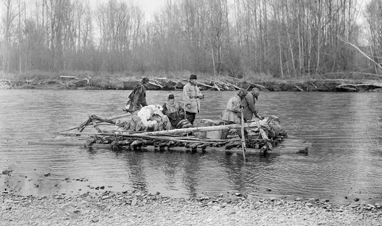 Исследователь Владимир Ильич Иохельсон с супругой, собакой и участниками экспедиции сплавляется по реке Коркодон (ныне Среднеканский район) по пути из Гижиги в Верхнеколымск на традиционном северном плоту. 1901 г.