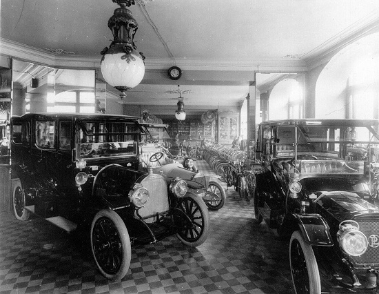Выставка моделей автомобилей и велосипедов в помещении торгового дома "Победа". 1912 г.