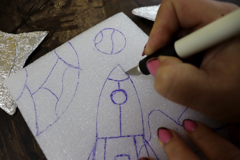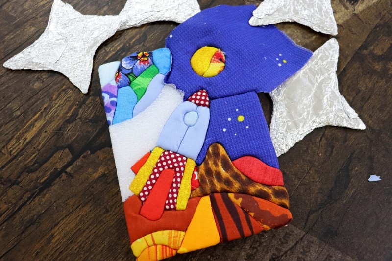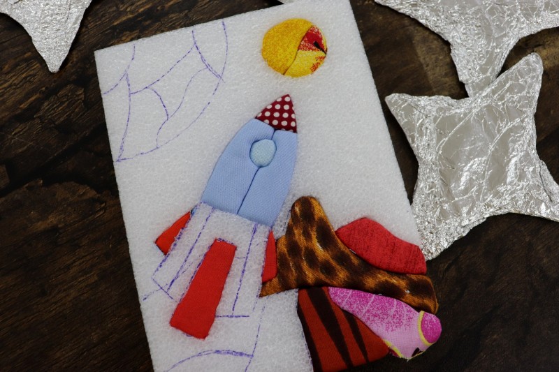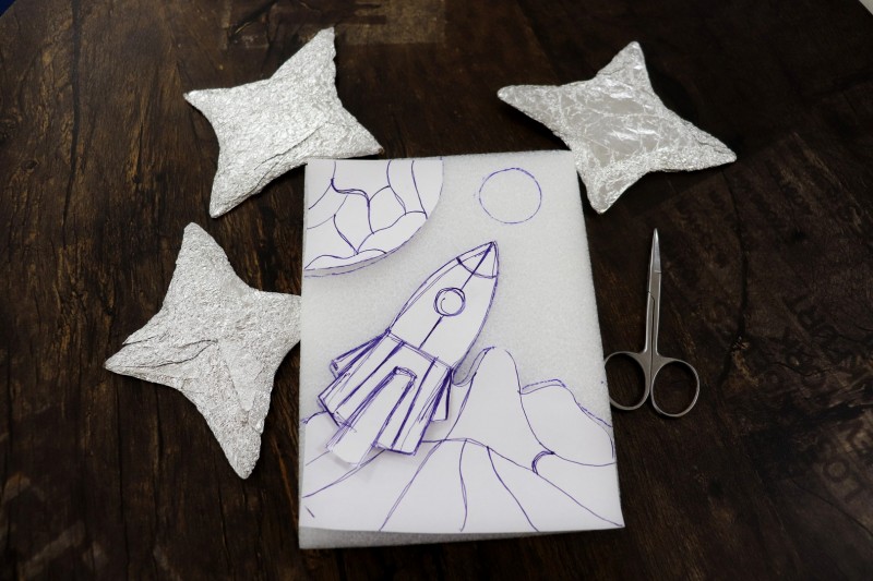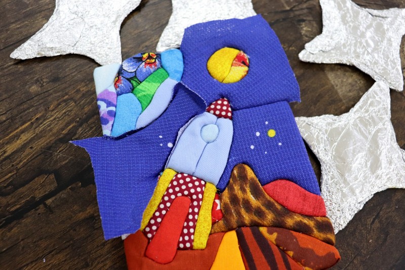 1. Определяемся с рисунком. Принимаем во внимание тот факт, что чем мельче детали, тем больше потребуется усилий, времени и терпения. Можно разделить рисунок на отдельные элементы, чтобы легче было перенести его на пенопластовую заготовку. Каждая фигура состоит из нескольких сегментов, которые будут заполняться тканью. Поделить ракету и планеты можно на части различной формы.