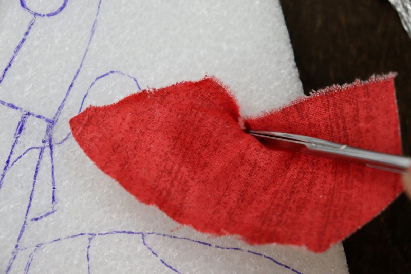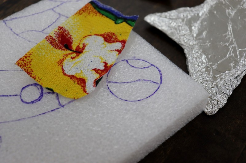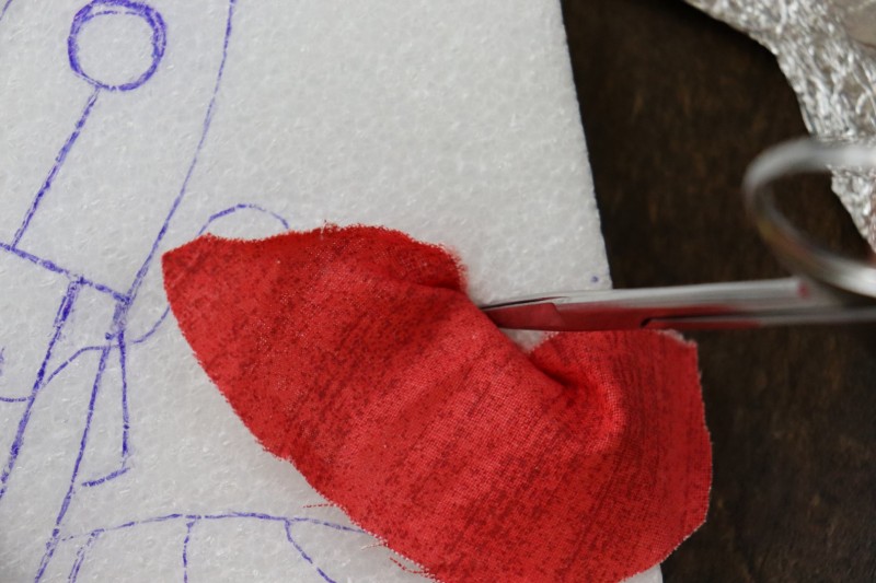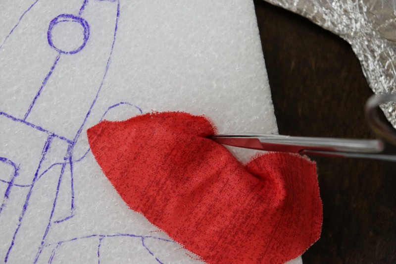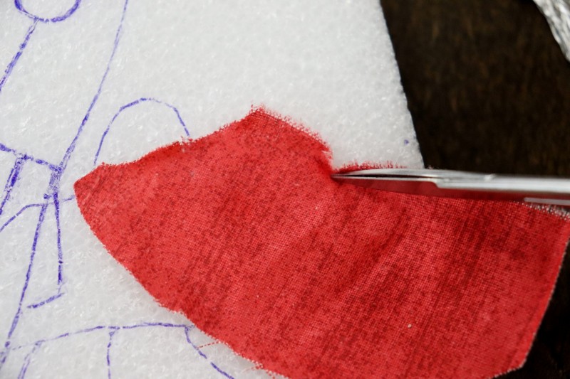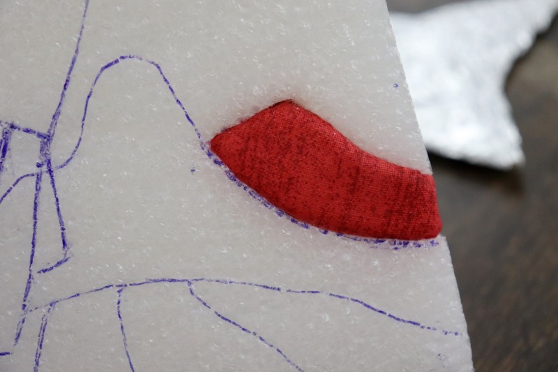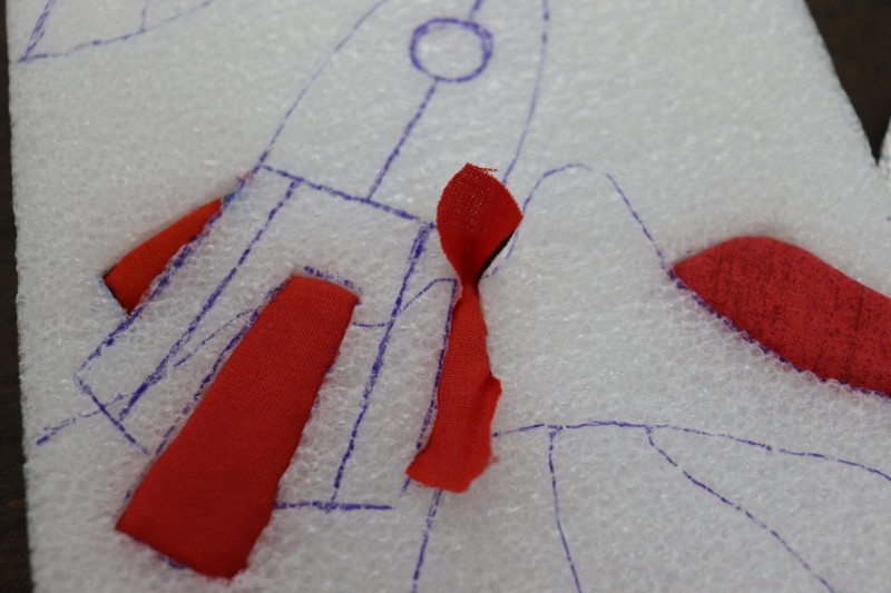 4. Возьмите один лоскуток, приложите его к нужному участку на пенопласте и заправляйте края в вырезанный контур. Проделайте эту операцию со всеми остальными лоскутками.