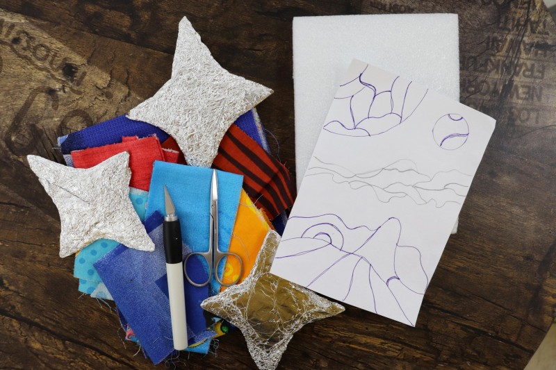 Мы не будем использовать шелк и деревянные дощечки, а сделаем композицию на кусочке пенопласта. Главное подобрать лоскутки тех цветов, которые у вас ассоциируются с космосом.