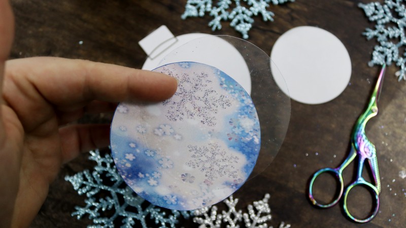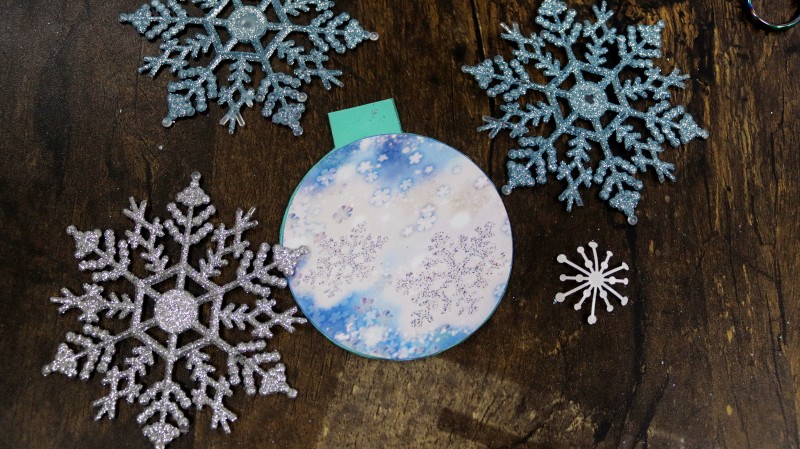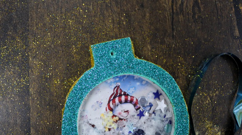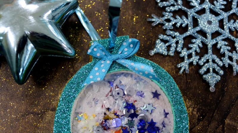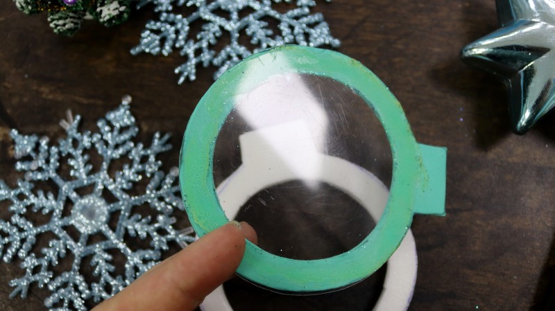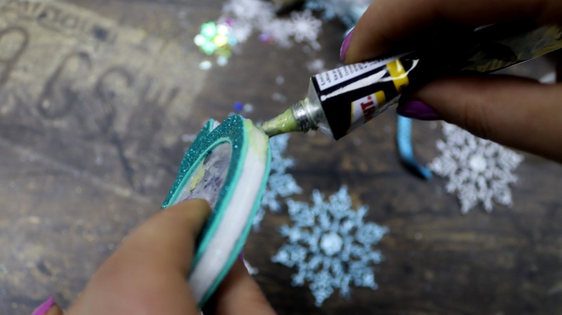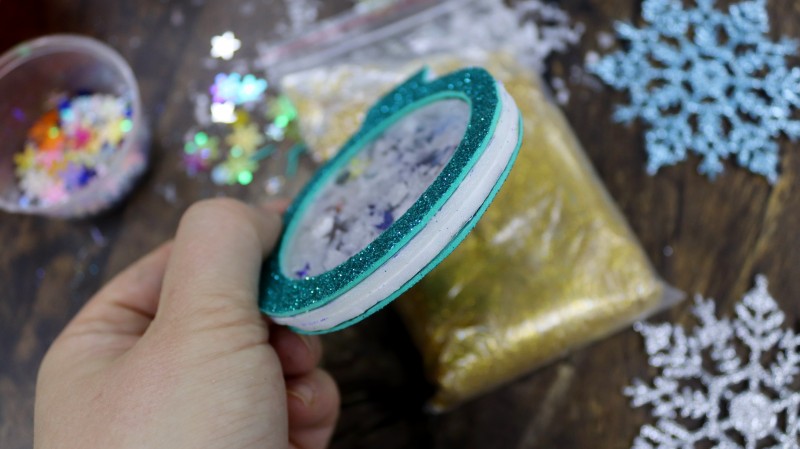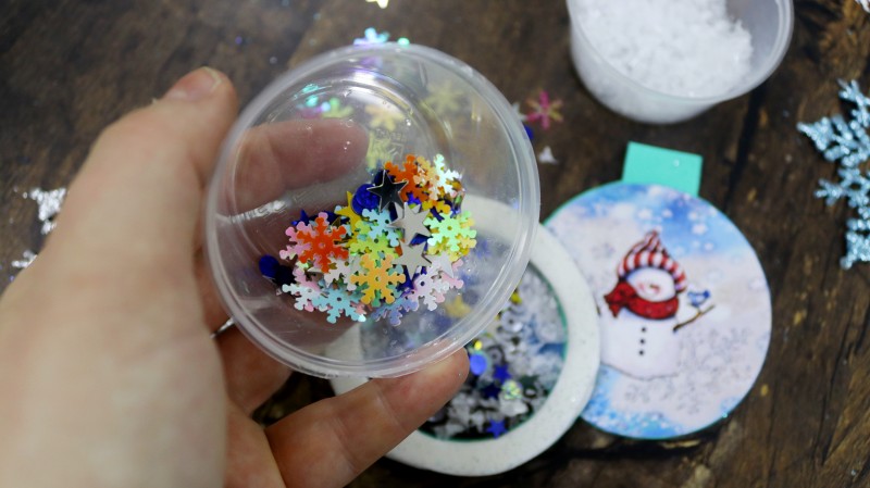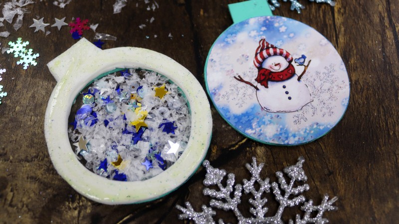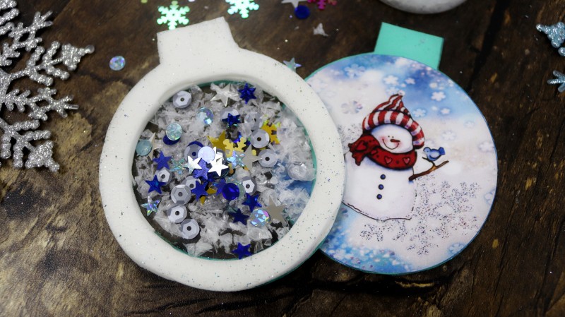 10. Теперь приступаем к самому интересному и творческому процессу. Заполняем полученное объемное "окошко" мелкими яркими детальками и искусственным снегом, которые будут перемещаться внутри при движении.