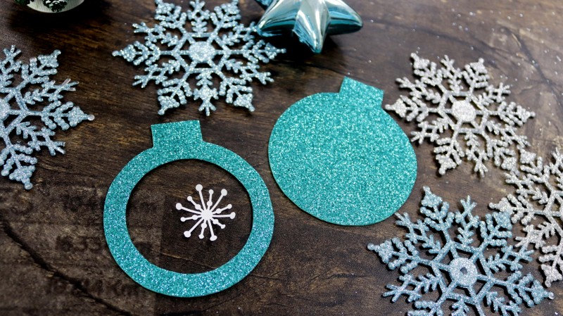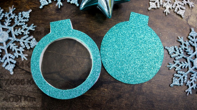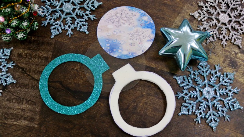 8. Приклеиваем подготовленный новогодний фон к изнаночной стороне заготовки из блестящего фоамирана без отверстия.