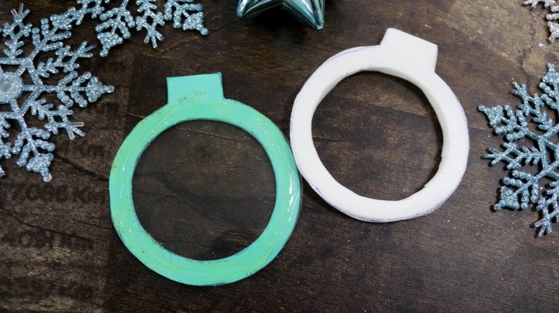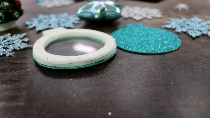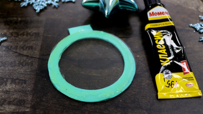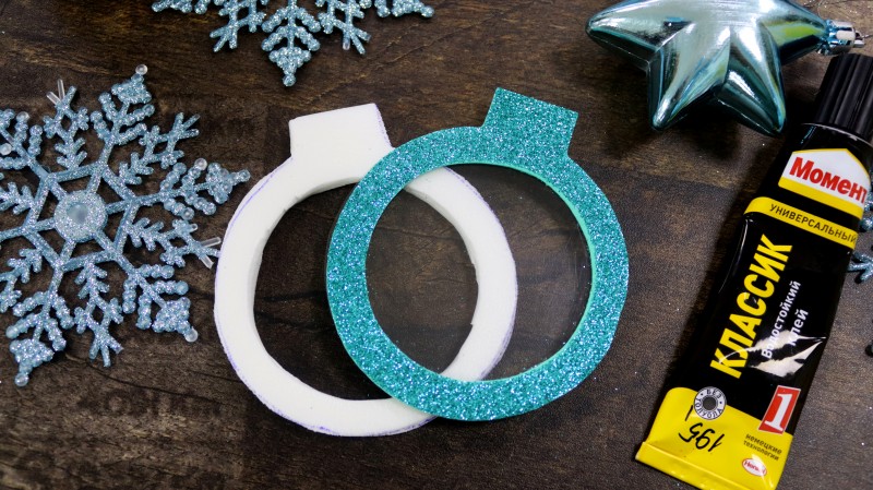 С изнаночной стороны заготовки с отверстием из блестящего фоамирана приклеиваем пластиковую заготовку.