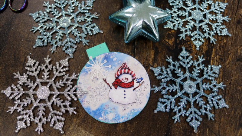 Приклеиваем картинку со снеговиком на заготовку с фоном.