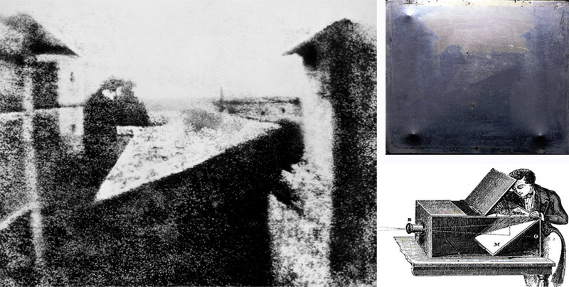 Первым успехом на пути к проявлению фотографии стало изобретение французомЖозефом Нисефором Ньепсом гелиографии. Изображение, полученное с помощью камеры-обскуры датировано 1826 годом. На этой фотографии под названием «Вид из окна в Ле Гра» был изображен вид из окна мастерской изобретателя. В настоящее время оригинал снимка находится в США в городе Остин в Исследовательском центре Гарри Рэнсома в специальном кейсе с бескислородной газовой смесью.