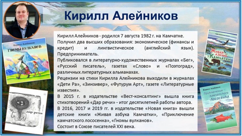 Кирилл Алейников – камчатский писатель, автор книг для взрослых и детей. Его произведения не только интересные, но и познавательные.