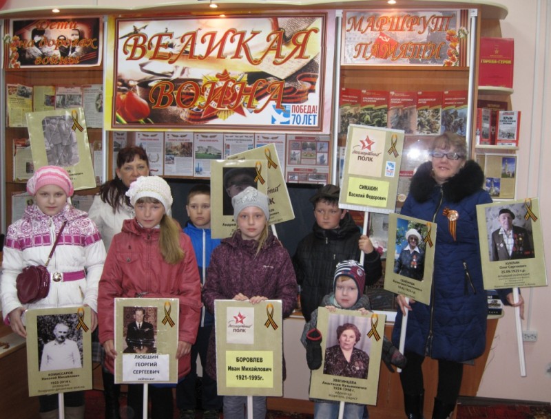 Чтобы привлечь к этой Акции школьников сотрудники центра проводят ряд патриотических уроков в начале мая по школам города, а также обзоры у книжных выставок, приуроченных Великой Победе. Транспаранты с фотографиями солдат и офицеров мастерили участники клуба «Очумелые ручки».
