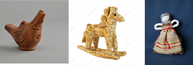 Сначала игрушки для детей делали дома, из подручного материала, потом появились мастера - игрушечники, которые стали делать игрушки на продажу. Но не каждой семье были по карману покупные игрушки, поэтому дети из небогатых семей продолжали играть в самодельные. Тряпичные куклы, деревянные чурбачки, соломенные кони, глиняные свистульки - вот какие игрушки были у детей русских крестьян.
