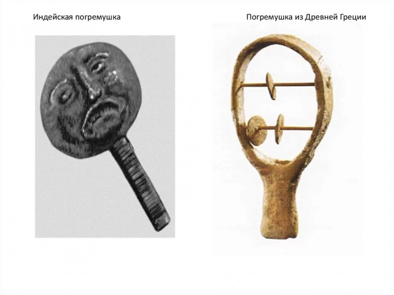 Как и сегодня, первой игрушкой ребенка была погремушка. В Древней Греции и Риме погремушки дарили новорожденному. Постукивая этими погремушками матери и кормилицы напевали песни колыбельные. От первобытных времен сохранилось поверье, что трещотки своим шумом отклоняют злых духов и тем самым оберегают ребенка.