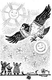 У чукчей ворон – главный герой мифов творения, символ Бога-творца. Он создает горы, животных, первых людей, учит их говорить и есть мясо животных, добывает небесные светила, существовавшие раньше лишь в верхней вселенной. Ворон раскрасил всех птиц, а себя из белого – в черный цвет, да еще пробил небесную твердь, дав всем свет.