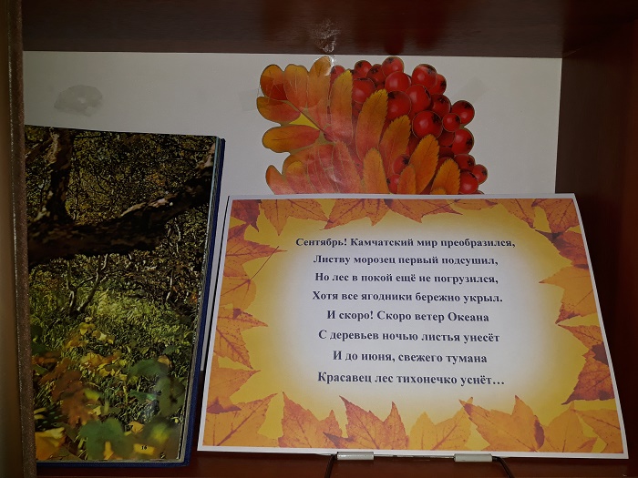 А у работников библиотек осенью есть большое желание познакомить своих читателей с литературным и художественным творчеством наших земляков при помощи литературно-художественных экспозиций, подготовленных на библиотечных площадках. Выставки, включающие фото работы и литературное творчество, создают в библиотеке непередаваемую атмосферу романтики, лёгкой осенней грусти и очарования камчатской природой.