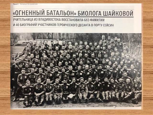 14-15 августа 1945 года в порту Сейсин, где располагалась главная военно-морская база Квантунской армии, десантировался 355-й отдельный гвардейский батальон морской пехоты Тихоокеанского флота под командованием Героя Советского Союза , гвардии полковника М.П. Бараболько. Захватив порт и высоты, батальон в течение суток до подхода главных сил флота вел непрерывный бой и отстоял позиции перед впятеро превосходящими силами противника. По итогам операции семеро морпехов стали Героями Советского Союза. В их числе – единственная на Тихокеанском флоте женщина, санинструктор Мария Цуканова. Учительница из Владивостока Галина Шайкова восстановила 683 фамилии и 40 биографий участников десанта и написала о них 458-страничную книгу.