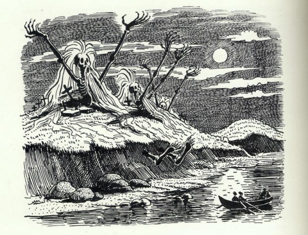 «Крест на могиле зашатался, и тихо поднялся из нее высохший мертвец. Борода до пояса, на пальцах когти длинные, еще длиннее самих пальцев. Тихо поднял он руки вверх. Лицо все задрожало у него и покривилось. Страшную муку, видно, терпел он. «Душно мне, душно!» - простонал он диким, нечеловечьим голосом. …Зашатался другой крест, и опять вышел мертвец, еще страшнее, еще выше прежнего; весь зарос, борода по колена, и еще длиннее костяные когти. Еще диче закричал он «Душно мне!» - и ушел под землю. Пошатнулся третий крест поднялся третий мертвец. Казалось, одни только кости поднялись высоко над землею. Борода по самые пяты; пальцы с длинными когтями вонзились в землю. Страшно протянул он руки верх, как будто хотел достать месяца, и закричал так, как будто хотел достать месяца, и закричал так,как будто кто-нибудь стал пилить его желтые кости…»