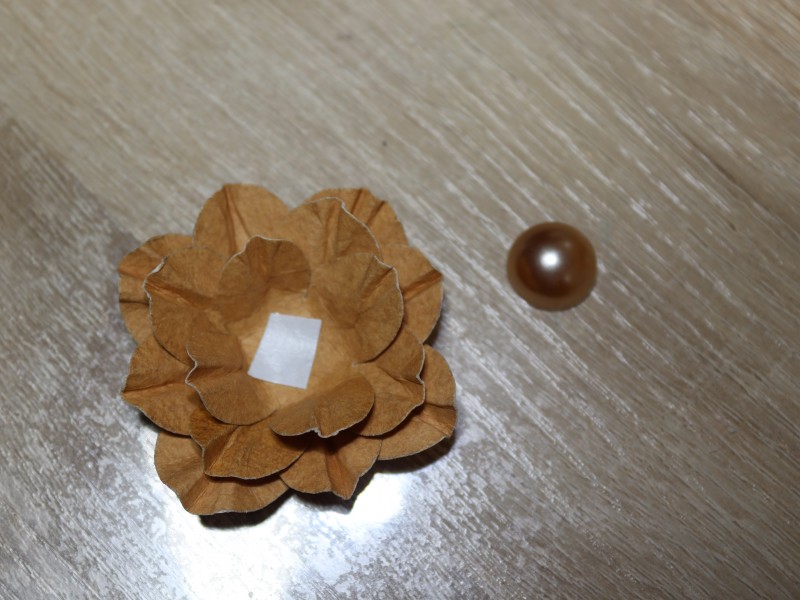 Соединяем 4 цветка между собой на двухсторонний скотч. И посередине крепим бусину.